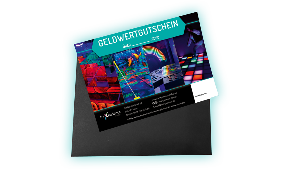 Du suchst nach der perfekten Geschenkidee? Wir haben die Lösung: Mit dem Erlebnisgutschein von funXperience Kassel verschenkst Du garantierten Spaß, Adrenalin, pure Emotionen und schaffst tolle Erinnerungen bei Lasertag, NeonGolf, Pixel Games oder Cube Challenges!